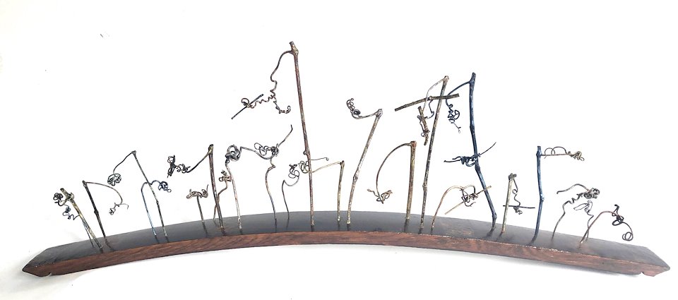 Wild grapevines, painted with iridescent acrylic paint, on recycled wine barrel board.